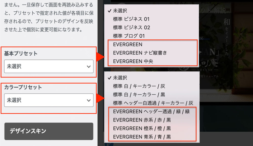 Evergreenの文字が入っているものが、Evergreenのスキン側で追加されたプリセットです。